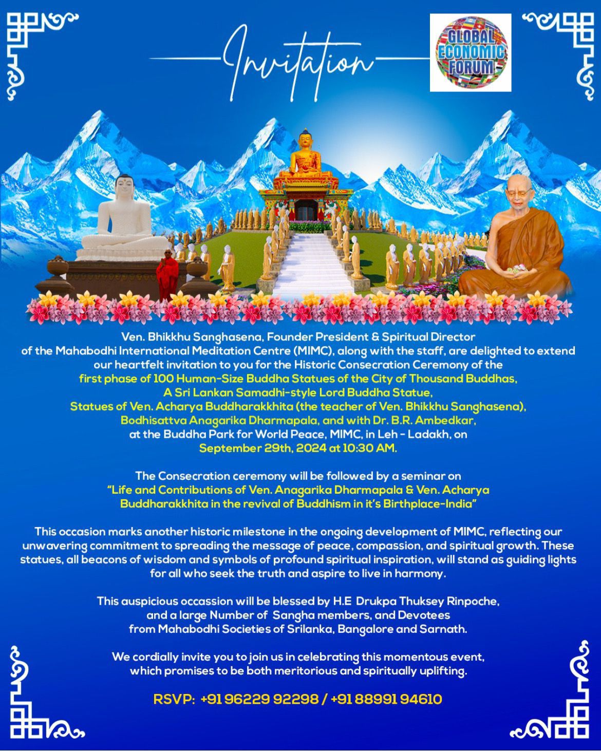 Dr Hari Krishna Maram Founder Chairman Global Economic Forum receives honour from His Holiness Ven. Bhikkhu Sanghasena, Founder President & Spiritual Director of the Mahabodhi International Meditation Centre (MIMC), along with the staff, We at Global Economic Forum happy to join hands for wonderful initiative and delighted to extend our heartfelt invitation to you for the Historic Consecration Ceremony of the first phase of 100 Human-Size Buddha Statues of the City of Thousand Buddhas, A Sri Lankan Samadhi-style Lord Buddha Statue, Statues of Ven. Acharya Buddharakkhita (the teacher of Ven. Bhikkhu Sanghasena), Bodhisattva Anagarika Dharmapala, and with Dr. B.R. Ambedkar, at the Buddha Park for World Peace, MIMC, in Leh – Ladakh, on