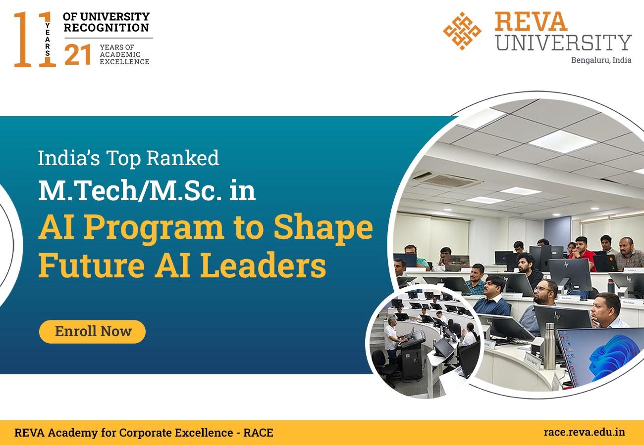 In a significant move towards revolutionizing Artificial Intelligence (AI) education, REVA Academy Corporate Excellence (RACE), REVA University, has proudly unveiled its M.Tech / M.Sc./ PG Diploma in AI program. Weekend classes are being offered to accommodate the hectic schedules of working professionals by providing university-style learning on campus.