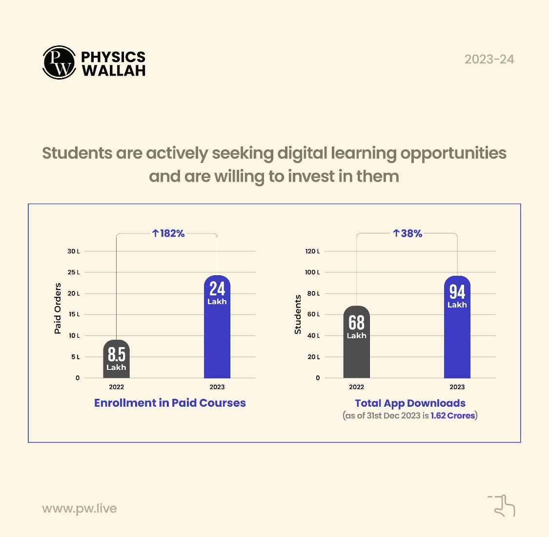 From 8.5 lakh paid orders in 2022 to 24 lakh orders in 2023, PW witnessed a 182% growth in the number of enrollment in paid courses, indicating a strong willingness among students to invest in online courses even in the post-pandemic era. This was accompanied by a 38% increase in app downloads from 68 lakh downloads in 2022 to 94 lakhdownloads in 2023 making it a total of 1.62 crore downloads as of 31st Dec 2023, suggesting that new students are actively seeking digital learning opportunities. With a new range of diverse online learning offerings such as affordable courses, multi-quality streaming, and increased internet access, students’ interest and loyalty towards online learning has seen a rise. PW has reached 98% of India pin codes, empowering students including the ones in remote areas where educational resources are scarce.