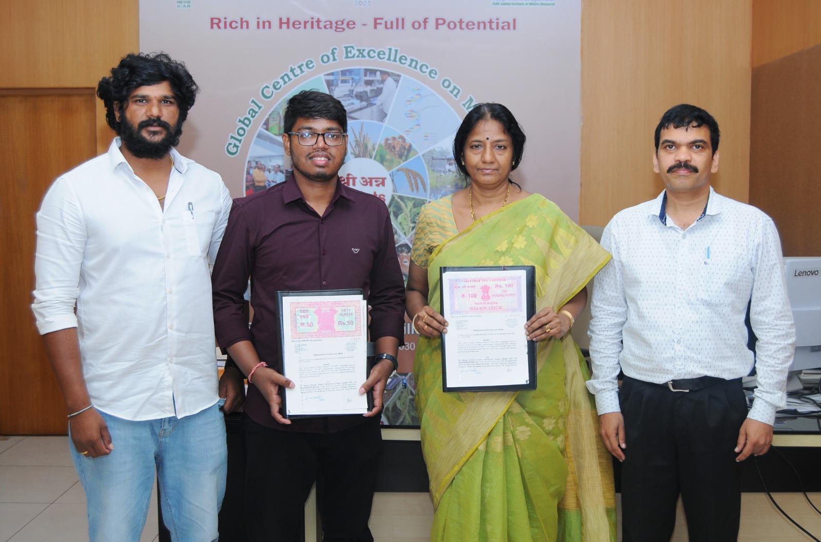 The signing ceremony was attended by Telugu Mallesh, Director of Manga Srinivas Foods, Dr. Stanley, a Scientist at ICAR-IIMR, and Sai Prakash, Chief Business Officer of Nutrihub – IIMR