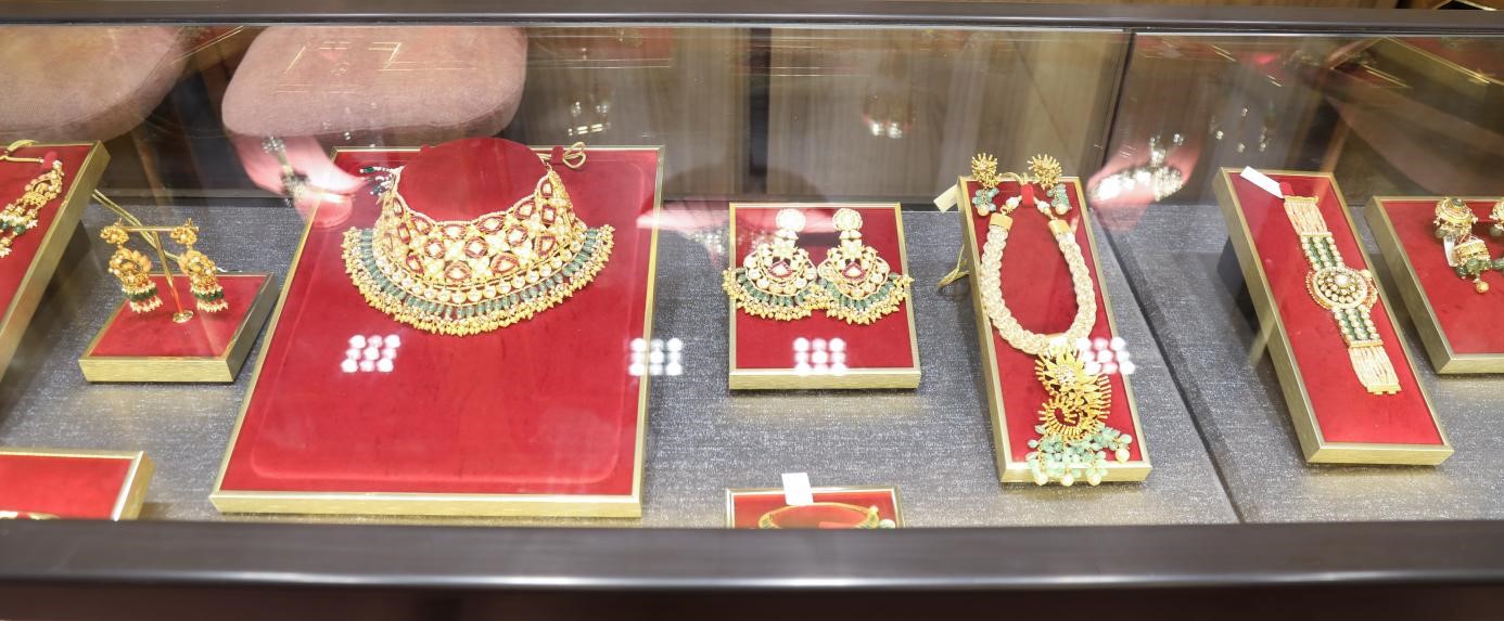 Brides can find 22kt gold sets adorned with coral-coloured stones, Meenakari work, Kundan rings, colourful stone bangles, enamel and pearls detailing. This look is perfect for brides who wish to add a pop of colour to their bridal wear. Pair it with a red lehenga, and you have a stunning combination that exudes vibrancy and grace.