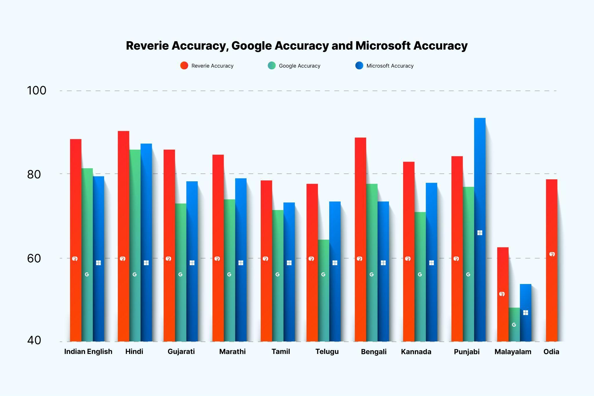 Bengaluru, India, Friday 19th July 2024– Reverie Language Technologies, a pioneer in language technology solutions specializing in Indian languages, announces a significant advancement in its Automated Speech Recognition (ASR) model accuracy, validated through the esteemed Kathbath dataset curated by AI4Bharat. Reverie benchmarked their ASR output with Google and Microsoft for Indian English, Hindi, Gujarati, Marathi, Tamil, Telugu, Bengali, Kannada, Punjabi, Malayalam, and Odia.