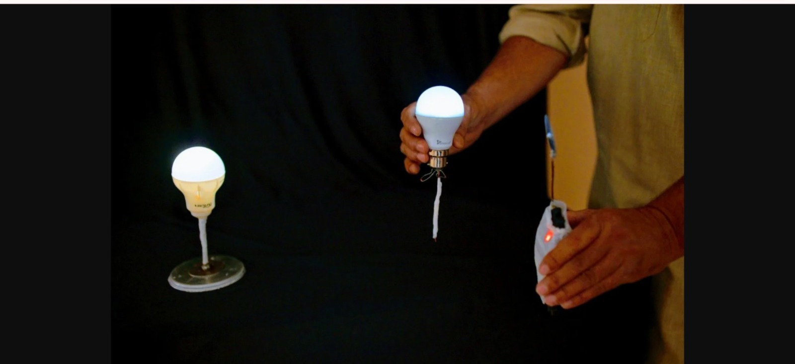 A prototype device is demonstrated on the INFRGY website. A 3.7volt transmitter sends RF signals to two LED bulbs equipped with circuitry to receive the signals and convert them to electricity.